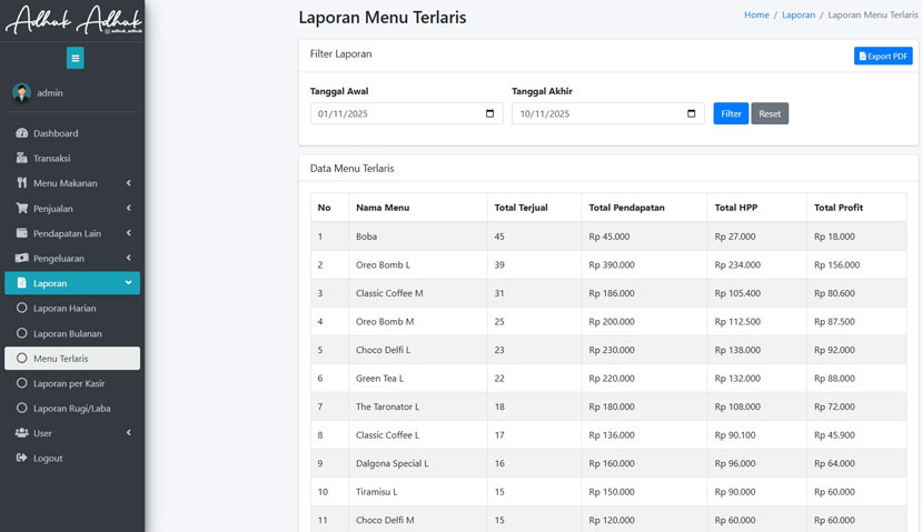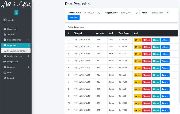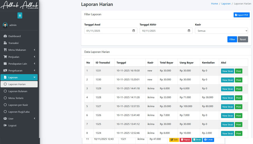 Dibangun menggunakan tampilan dashboard modern dan responsif, aplikasi ini memudahkan admin atau kasir dalam memantau data penjualan, laporan, dan aktivitas keuangan secara real time.