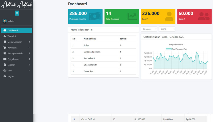 Dengan tampilan statistik dan grafik yang menarik, pemilik usaha dapat langsung melihat performa penjualan harian tanpa perlu menghitung manual.